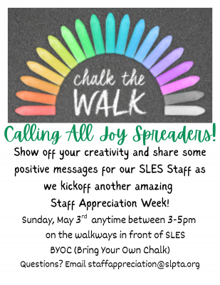 To kick off Staff Appreciation Week, join us on Sunday, May 3rd anytime between 3-5pm in front of SLES.