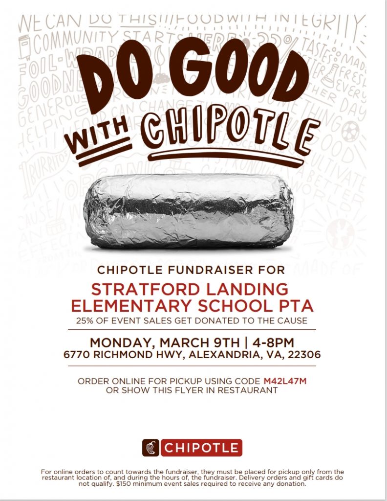Chipotle Restaurant will donate 25% of ONLINE and IN-STORE orders to Stratford Landing ES PTA.